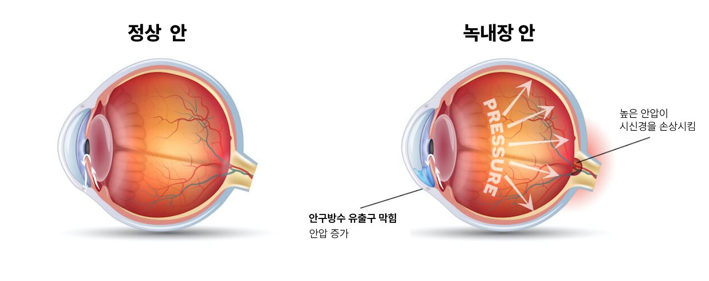 안압 상승이 주요 원인이나, 한국인에서는 안압이 정상인 녹내장의 비율도 높으므로