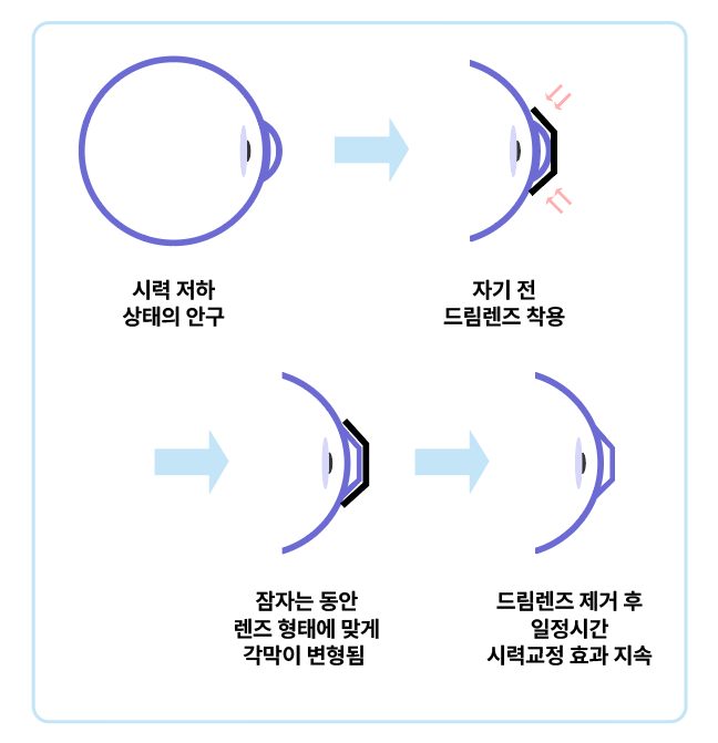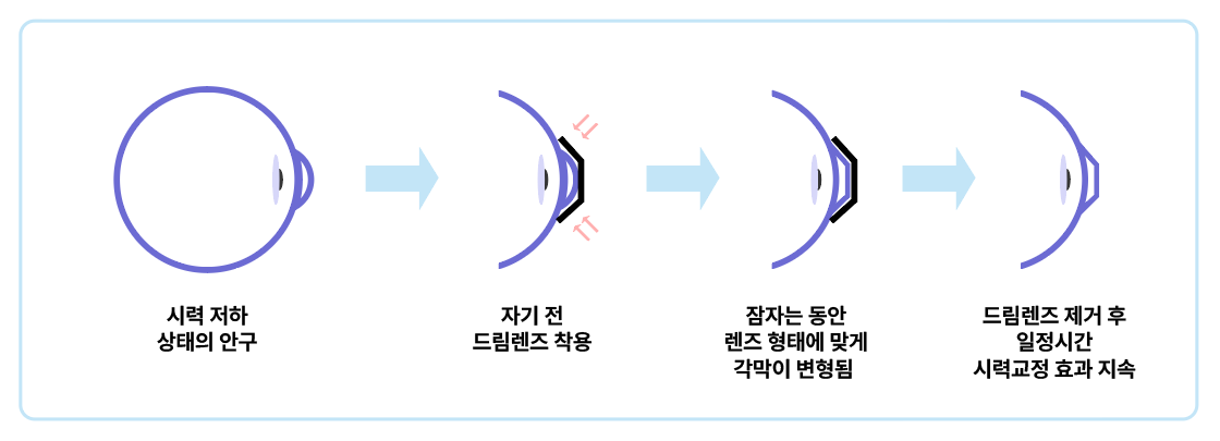 수면 중의 착용으로 각막이 변형된 상태가 하루 정도 지속되기 때문에, 그 다음날 아침에 렌즈를 빼도 시력이 유지되는 원리입니다.